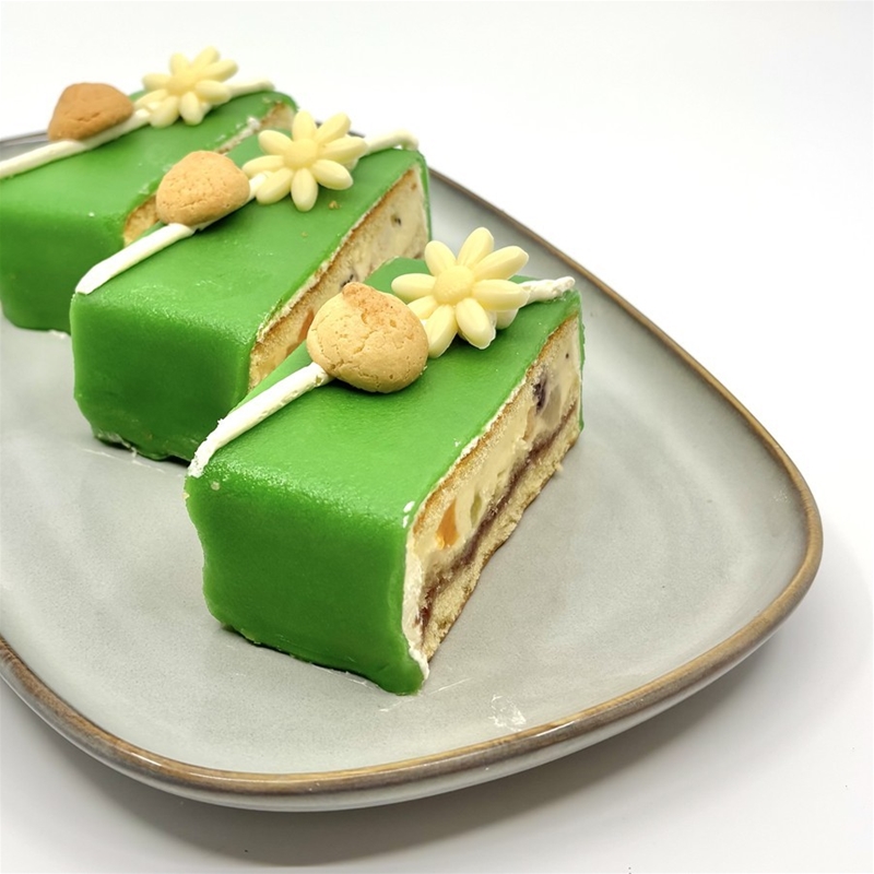 Een klassiek gebakje bestaande uit luchtige cake met room, fruit, bitterkoekjes en een laagje marsepein.